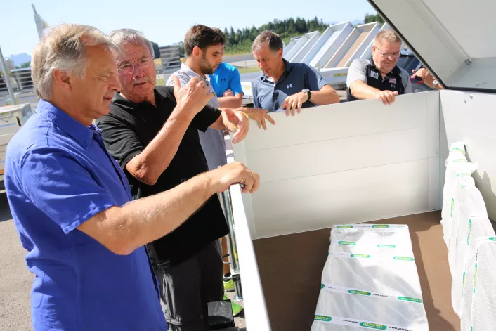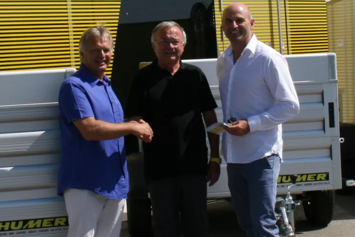 Von der Qualität der Humer-Anhänger überzeugten sich bei der Fahrzeugübernahme die künftigen Fahrer sowie Sportdirektor Hans Pum und Toni Giger (Leiter Abt. Forschung und Entwicklung).