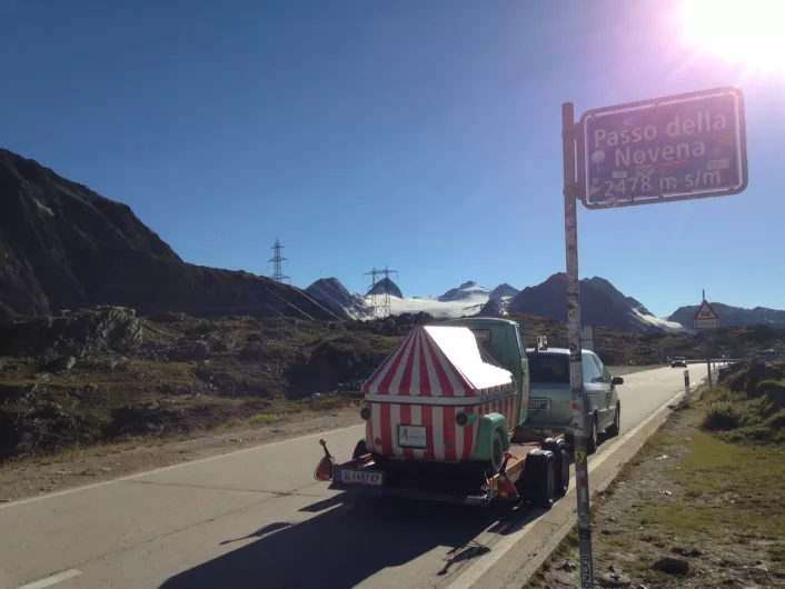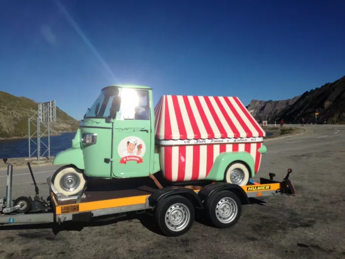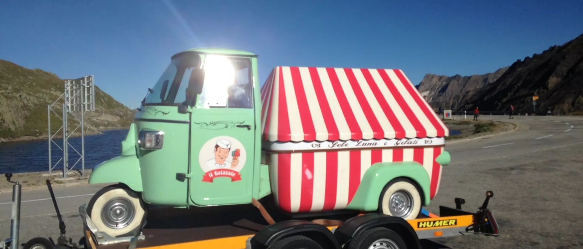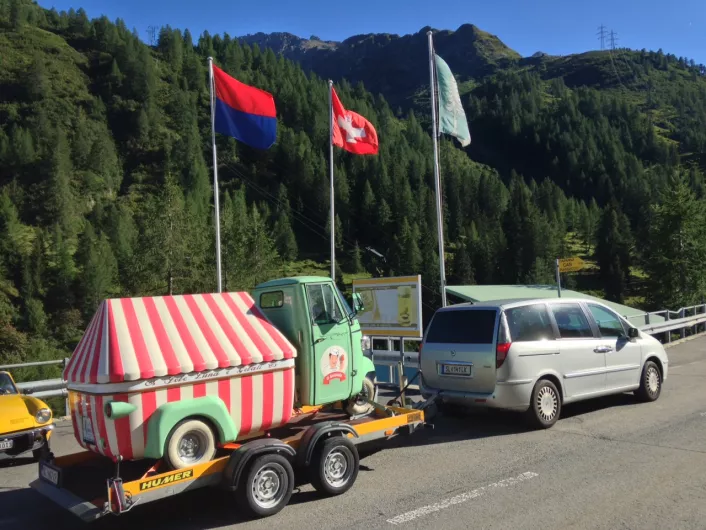 Heinz Müller aus Straßwalchen - vielen besser bekannt als Swixi - macht sich jedes Jahr auf den Weg nach Italien: mit "im Gepäck": sein Eismobil, das er am Absenkanhänger von HUMER locker über die Alpen bringt. Hier am Passo della Novena auf 2476m Seehöhe.