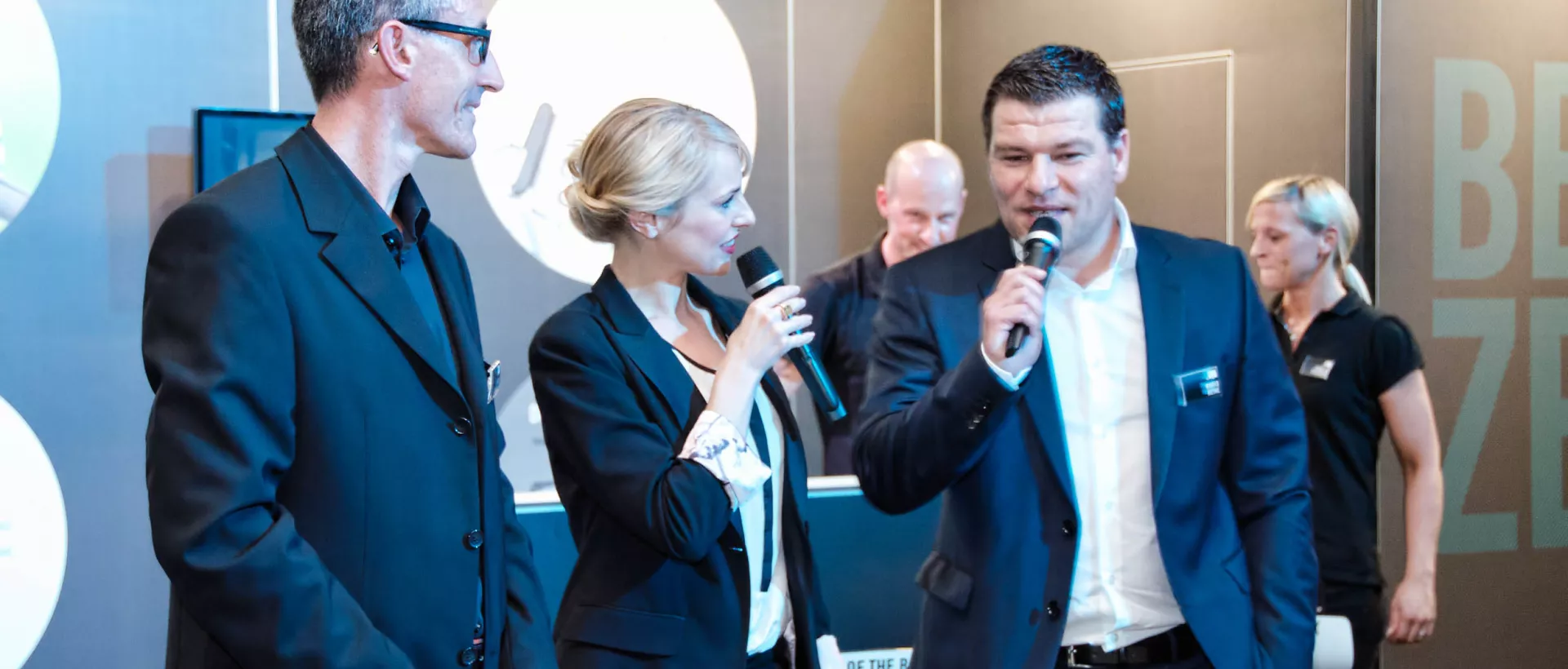 Sie waren ebenso überrascht wie Moderatorin Silvia Schneider, die durch die Challenge führte, als ein kompletter Messestand, mit allem Drum und Dran, von den Böden und Wänden über die Bar bis hin zu Lampen, Kaffeemaschine und Kühlschrank , aus dem kleinen Anhänger gezaubert wurde.