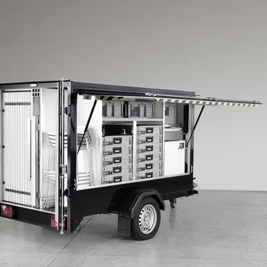 Variabel einsetzbare Stellwände, Bodenbelag, LED-Beleuchtung, Bar-Element, Hocker, Tisch, Kühlschrank, Kaffeemaschine und Videoscreen - all das ist sicher und platzsparend verstaut in einem Kofferanhänger von HUMER.