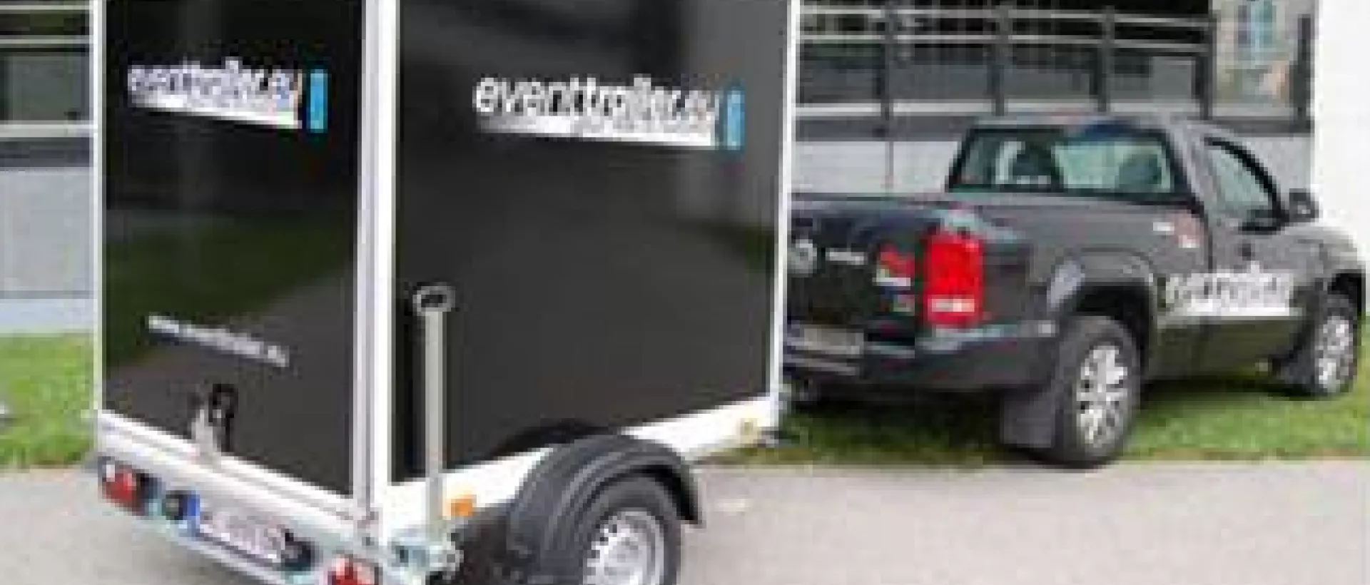 Zur Ausstattung des leichten Anhängers zählen ein Technikboard mit Tonanlage und Funkmikro, ein Kühlschrank, eine Kaffeemaschine und genügend Stauraum für Ihr Werbematerial.