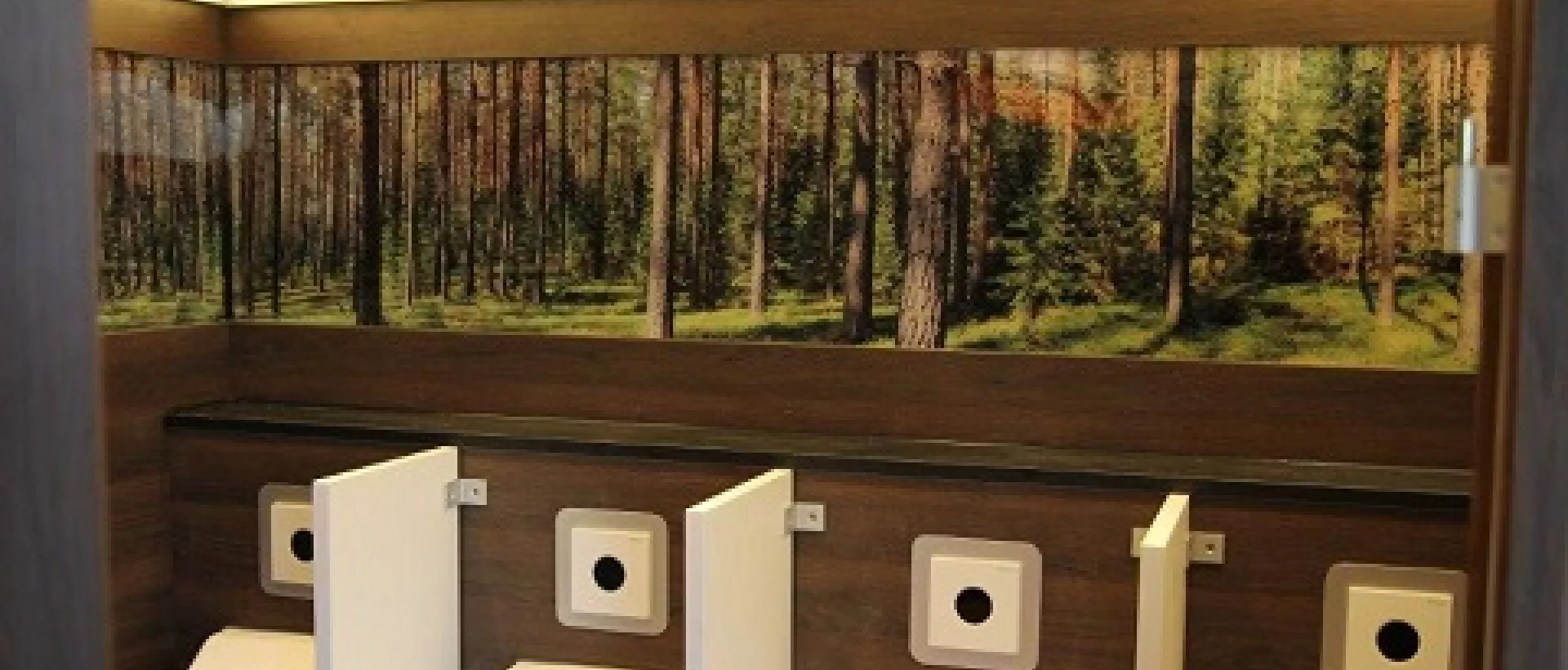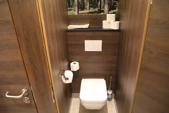 Dabei wurde bei der Planung und Ausführung des Anhängers auf Zweckmäßigkeit und Hochwertigkeit geachtet. Ein durchgehender Spezialboden der sich im Randbereich nahtlos ca. 100 mm an der Seitenwand hochzieht, die Holzverkleidungen wurden im Übergang zum Boden mit Edelstahlblechen gestaltet um eine optimale Reinigungsmöglichkeit und Langlebigkeit zu erzielen. Ein Extra Stauraum zwischen den komplett abgetrennten Männer und Frauenabteil gibt dem Reinigungspersonal die Möglichkeit Putz und Auffüllmaterial zu verstauen. Dort verbirgt sich auch die Technik wie Stromversorgung, Radio und DVD Player. Ein im Anhänger umlaufendes Waldpanorama im Hintergrund beleuchtet kann natürlich auf Kundenwunsch individuell gestaltet und verändert werden.