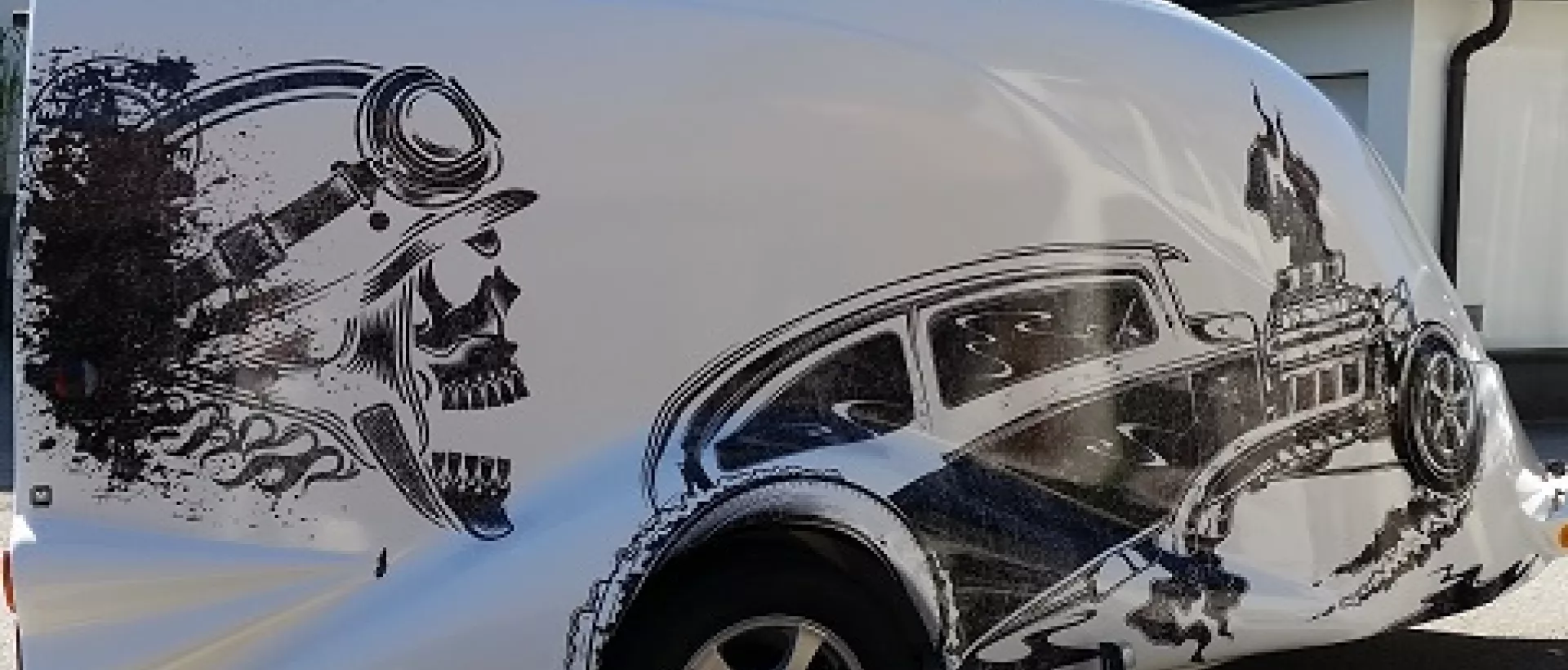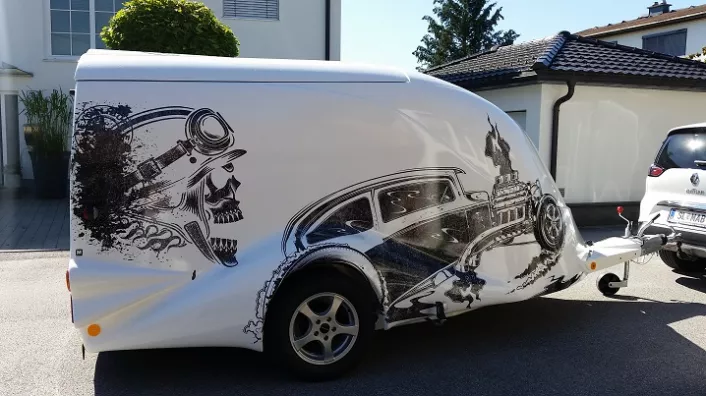 Für den einmaligen Look wurde mit einem externen Partner ein Design für den Motorradanhänger Excalibur entwickelt - um die Beklebung kümmerte sich selbstverständlich unser Serviceteam.