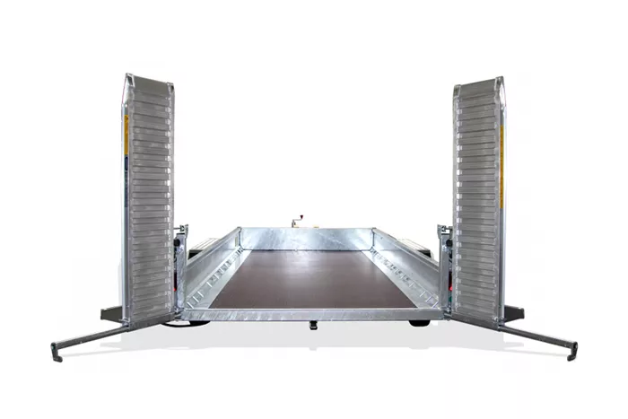 In enger Zusammenarbeit mit unseren Kunden und Partnern aus der Baubranche haben wir ein neues Rampensystem entwickelt, das den Be- und Entladevorgang Ihres Baumaschinenanhängers revolutioniert. Die extrem belastbaren Auffahrschienen für die Beladung von Fahrzeugen lassen sich mit wenigen Handgriffen seitlich schwenken und ermöglichen so eine einfache Beladung des Anhängers durch einen Gabelstapler - so wird der Ladevorgang von Palettenware zum Kinderspiel!