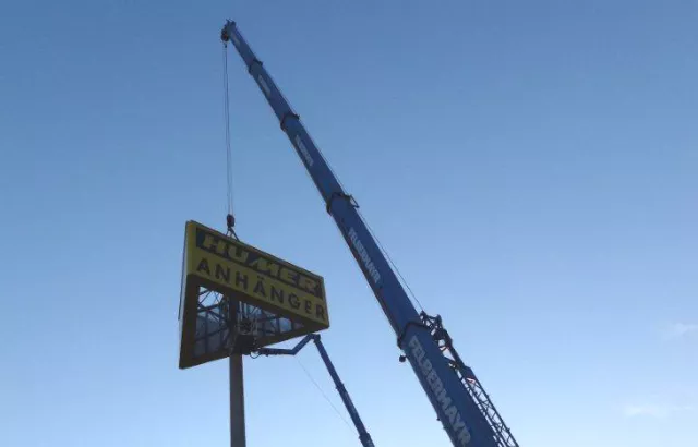 Überlange, sperrigen Einzelteile werden mit dem HUMER-Pritschenhochlader transportiert.