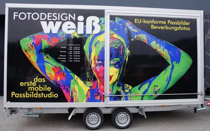 Um mit einem mobilen Standort Kunden in ganz Niederösterreich bedienen zu können, wurde für das Unternehmen ein vollausgestattetes Fotostudio in einen PKW Anhänger eingebaut.